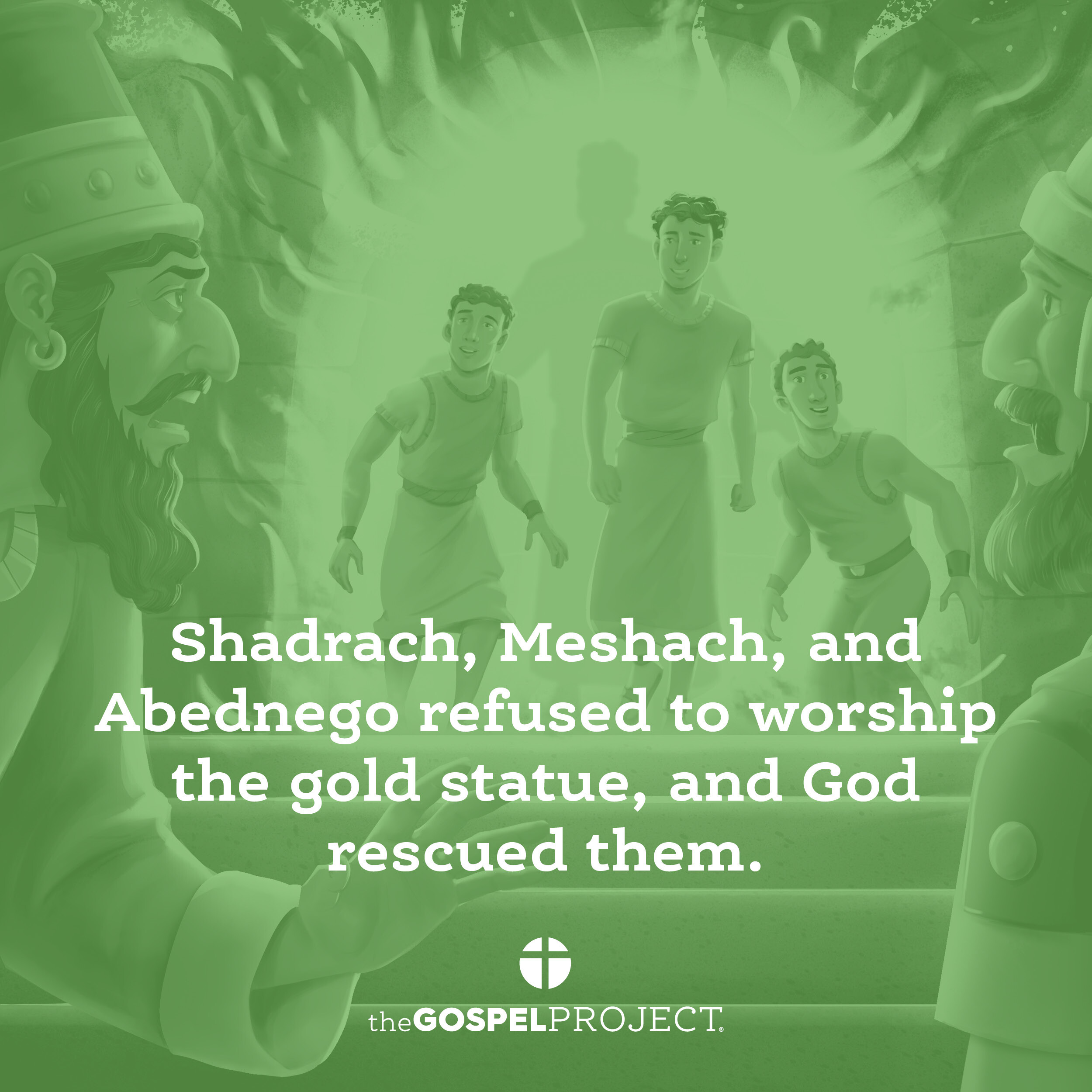 STORY POINT: Shadrach, Meshach, and Abednego refused to worship the gold statue, and God rescued them.