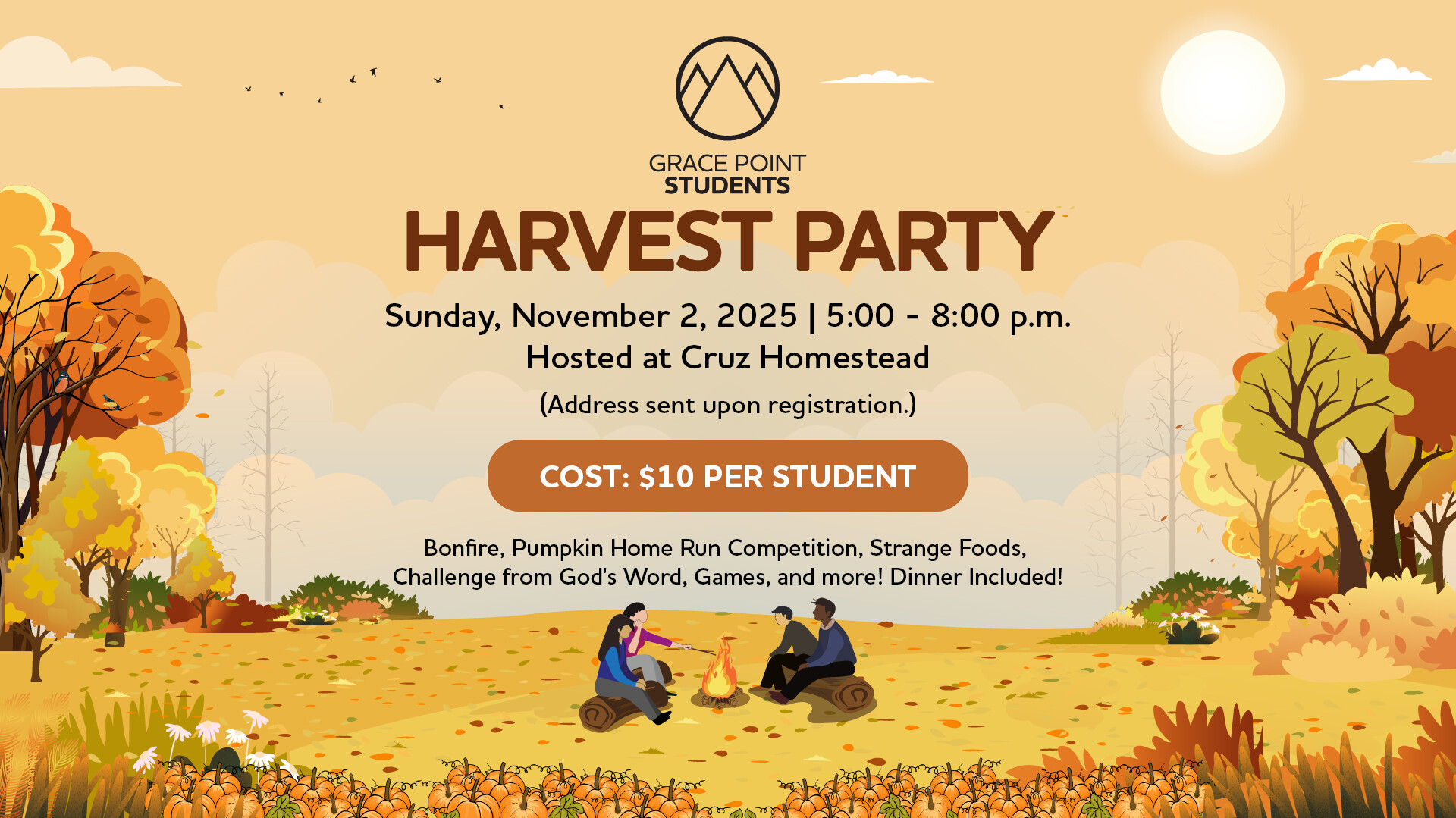 Join us for an epic Student Ministry Harvest Party on Sunday, November 2, from 5:00-8:00 p.m.! Enjoy a fun night with a bonfire, pumpkin home run competition, strange foods, exciting games, a challenge from God's Word, and more! Dinner is included, and the cost is $10 per student. Don't miss out on this unforgettable evening!